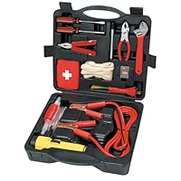 (More customer reviews)It has the necessary flashlight, jumper cables, air pump for the tires and emergency stuff. The case is big and bulky and the stuff doesn't stay secured in the case. The case doesn't have a good closing catch. I threw the case out and bought a bag and put all the stuff in the bag.